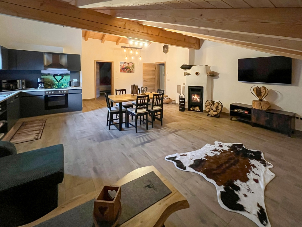 - Essbereich mit Tisch und Stühlen sowie Kaminofen
