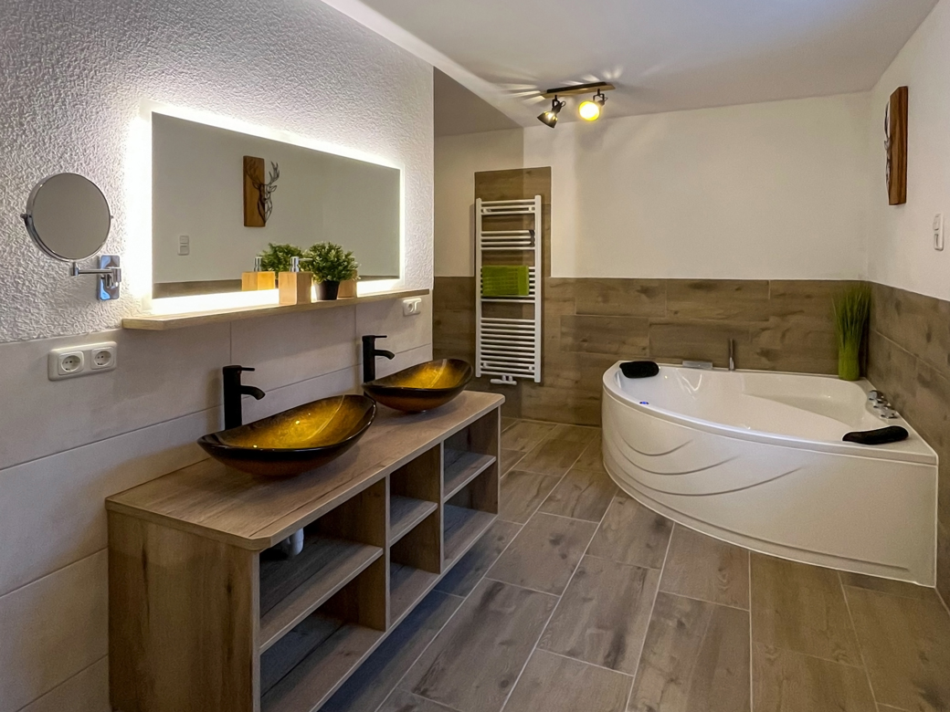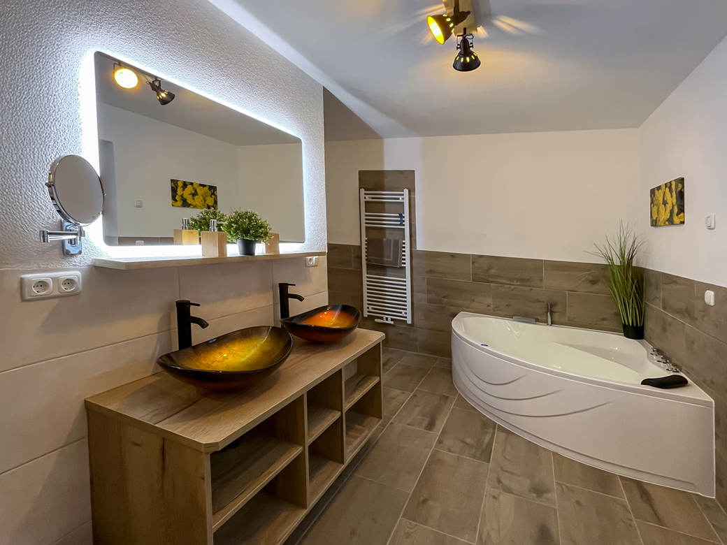 - Ein Badezimmer mit Dusche, Badewanne mit Relaxe-LED Farblichtspiel, WC, Waschbecken, LED-Spiegel, Schminkspiegel, Fön & Handtuchtrockner
