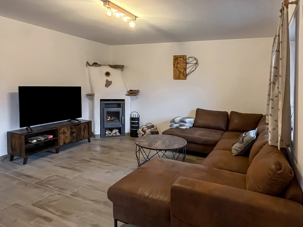 - Wohnbereich mit Couch, Couchtisch, SAT-TV und Kaminofen